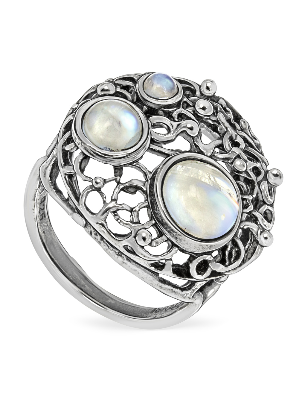 Круглое серебряное кольцо с натуральными лунными камнями из Шри-Ланки разного размера. Сверху шинка расширяется, добавляя кольцу объема.Огранка камней - кабошон. Диаметр - 7 мм, 5 мм, 2 мм. Традиционно израильские украшения не родируются, а покрываются чистым серебром 999 и оксидируются (чернятся). Черненое серебро надежно защищено от воздействия внешних факторов. Украшения Эйлат произведены вручную израильскими ювелирами по старинной технологии. В коллекции винтажных украшений Вы не найдете двух одинаковых изделий. Объемное широкое кольцо с белым камнем выгодно подчеркнет вашу индивидуальность, может быть вечерним аксессуаром или украшением на каждый день! Причудливые формы, неровные поверхности, изогнутые линии, мягкие переходы - все это элементы дизайна EILAT, позаимствованные у природы.