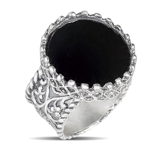 Крупное, лаконичное серебряное кольцо с натуральным черным ониксом из Бразилии. Декоративная глухая закрепка оникса украшает изделие. Широкая массивная шинка декорирована объемным узором и окантована по бокам серебряными жгутиками. Редкая огранка камня - таблетка. Диаметр оникса - 19 мм. Традиционно израильские украшения не родируются, а покрываются чистым серебром 999 и оксидируются (чернятся). Черненое серебро надежно защищено от воздействия внешних факторов. Украшения Эйлат произведены вручную израильскими ювелирами по старинной технологии. В коллекции винтажных украшений Вы не найдете двух одинаковых изделий. Широкое кольцо-печатка с черным камнем выгодно подчеркнет вашу индивидуальность, может быть вечерним аксессуаром или украшением на каждый день! Причудливые формы, неровные поверхности, изогнутые линии, мягкие переходы - все это элементы дизайна EILAT, позаимствованные у природы. Приятным дополнением является большая, приятная на ощупь фирменная коробка EILAT - готовый подарок для себя или близкого человека.