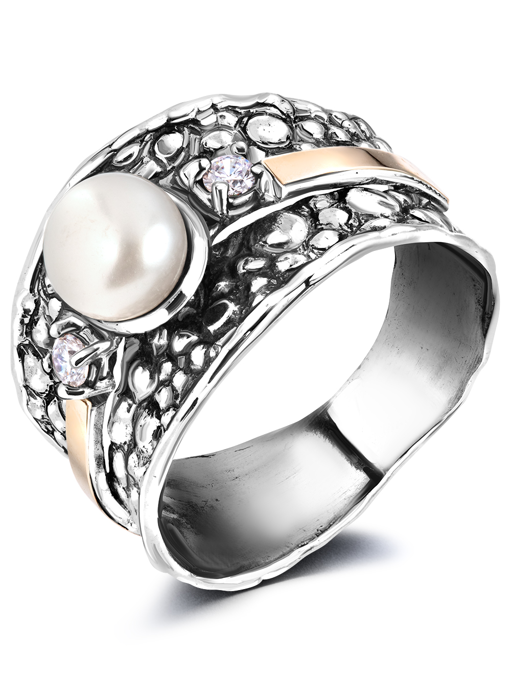 Широкое серебряное кольцо женское в винтажном стиле с жемчугом и фианитом. Крупное кольцо серебро 925 украшено золотым элементом (это не позолота, а цельная золотая пластина толщиной 0,2 мм., надежно припаянная к серебру). В отличие от позолоты, золото на оригинальном кольце не сотрется. Необычное кольцо с камнем выгодно подчеркнет вашу индивидуальность, может быть вечерним аксессуаром или украшением на каждый день.