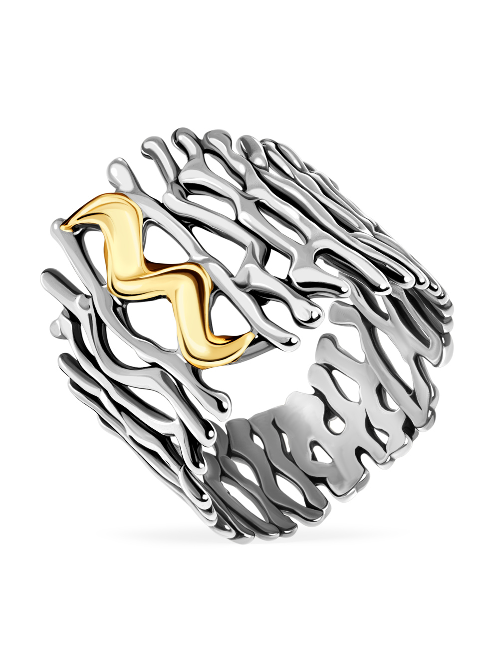 Крупное серебряное кольцо украшено золотым элементом (это не позолота, а цельные золотая пластина толщиной 0,2 мм., надежно припаянная к украшению). В отличие от позолоты, золото на этом кольце никогда не сотрется. Удобная посадка кольца. Максимальная ширина кольца в месте золотой вставки - 22 мм. Традиционно израильские украшения не родируются, а покрываются чистым серебром 999 и оксидируются (чернятся). Черненое серебро надежно защищено от воздействия внешних факторов. Украшения Эйлат произведены вручную израильскими ювелирами по старинной технологии. В коллекции винтажных украшений Вы не найдете двух одинаковых изделий. Широкое кольцо без камней выгодно подчеркнет вашу индивидуальность, может быть вечерним аксессуаром или украшением на каждый день!Причудливые формы, неровные поверхности, изогнутые линии, мягкие переходы - все это элементы дизайна EILAT, позаимствованные у природы.