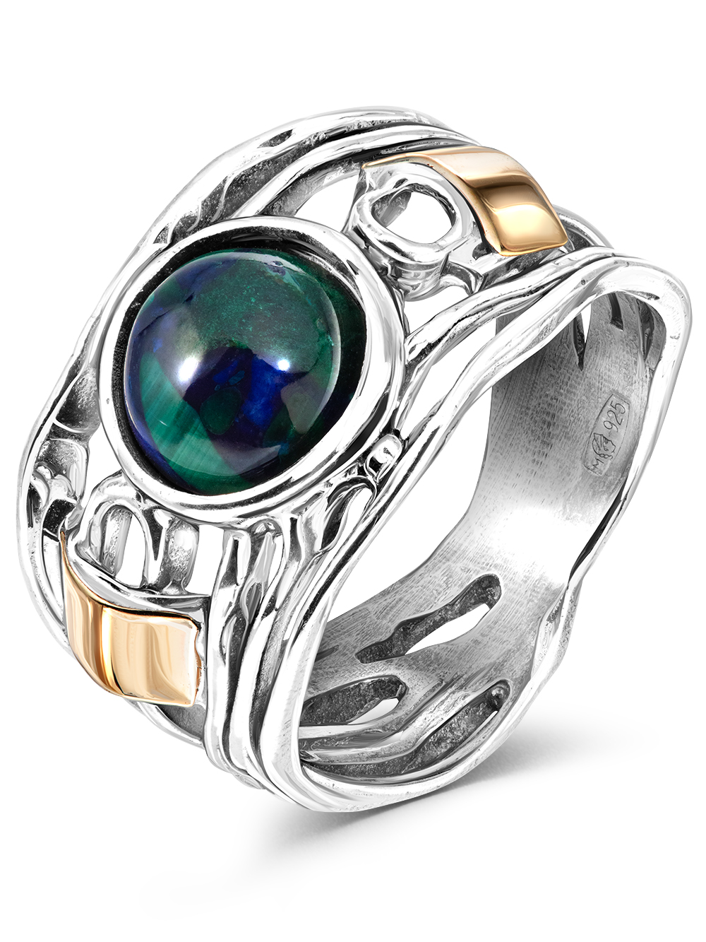 Широкое серебряное кольцо в винтажном стиле с натуральным азуритом. Серебро 925, ручная работа, производство Израиль. Крупное кольцо украшено золотым элементом (это не позолота, а цельная золотая пластина толщиной 0,2 мм., надежно припаянная к серебру). В отличие от позолоты, золото на оригинальном кольце не сотрется. Необычное милое кольцо с натуральным зеленым камнем выгодно подчеркнет вашу индивидуальность.