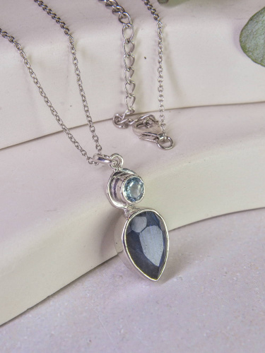 Серебряный кулон на цепочке с натуральным лабрадоритом и топазом. Цепь в комплекте 40-45 см. Современная коллекция украшений в стиле минимализм создана в Израиле. В коллекции красивые кулоны, подвески и колье на шею с натуральными камнями. Покрытие родий. Отличный подарок на 8 марта, подруге, маме, девушке, на день рождения, женщине, бабушке, сестре, жене, свекрови, коллеге, учителю, тете