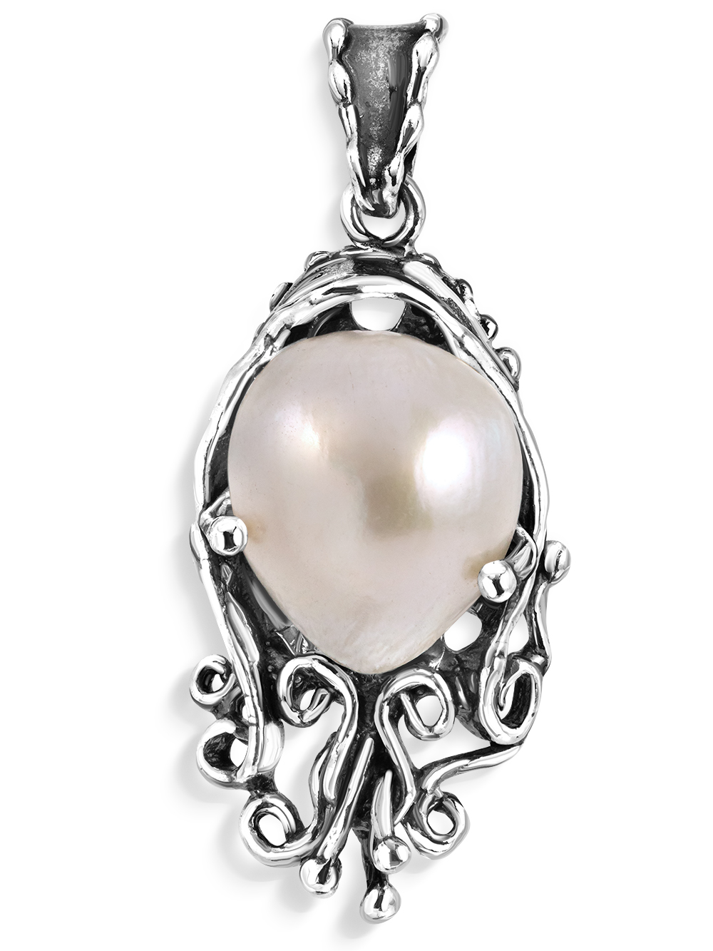 Крупная серебряная подвеска в винтажном стиле с натуральным жемчугом. Необычная подвеска на шею выгодно подчеркнет вашу индивидуальность, может быть вечерним аксессуаром или украшением на каждый день. Размер оригинальной длинной подвески с ушком - 38 мм. Размер подвесного элемента - 27 на 14 мм. Размер белого барочного жемчуга - 12 на 14 мм. Ср. вес - 5,4 гр. Традиционно израильские украшения не родируются, а покрываются чистым серебром 999 и оксидируются (чернятся). Черненое серебро надежно защищено от воздействия внешних факторов. Кулон серебро 925 с белым крупным камнем выгодно подчеркнет вашу индивидуальность, может быть вечерним аксессуаром или украшением на каждый день. Изделия Эйлат произведены вручную израильскими ювелирами по старинной технологии. В коллекции Вы не найдете двух одинаковых. Причудливые формы, неровные поверхности, изогнутые линии, мягкие переходы - все это элементы дизайна EILAT, позаимствованные у природы.