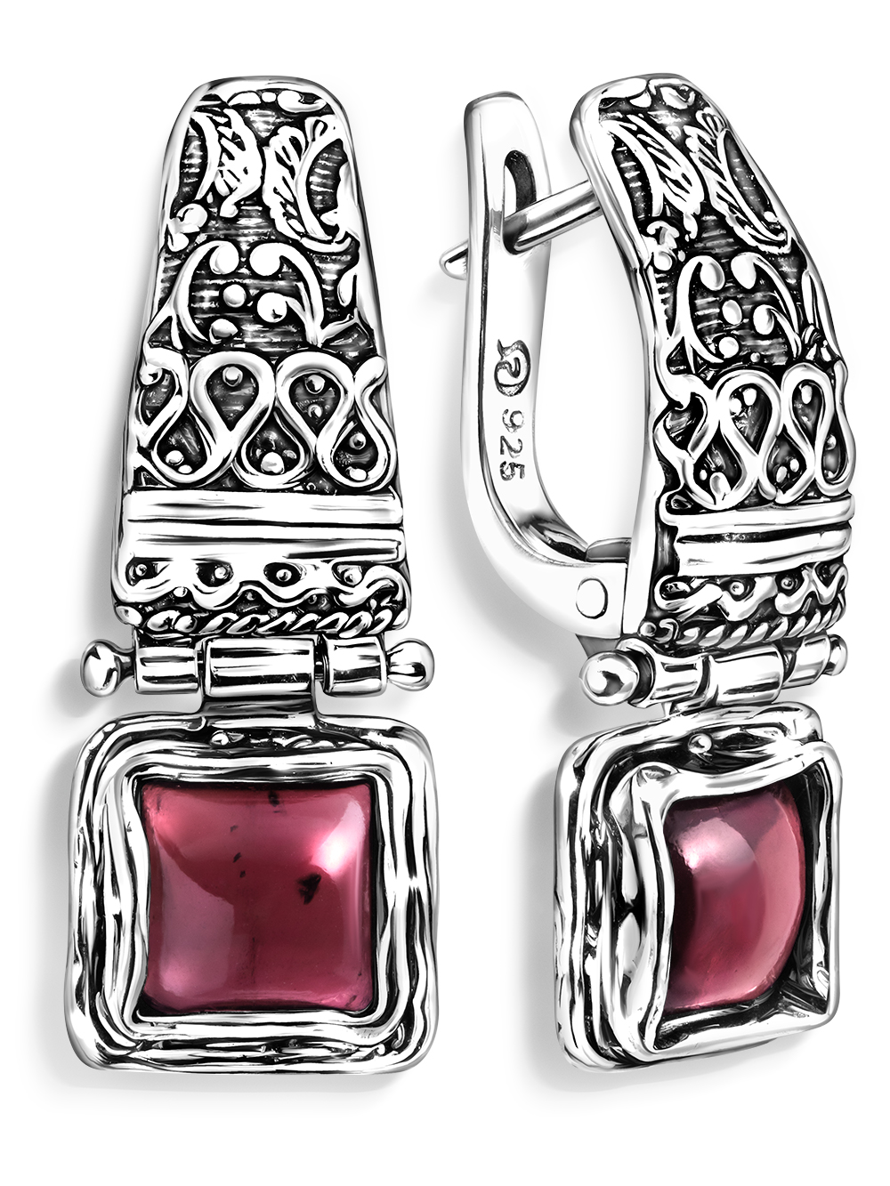 Серебряные серьги в этническом стиле с натуральным гранатом. Декоративная глухая закрепка граната украшает изделие. Надежный английский замок также украшен узором. Подвижный подвесной элемент придает висячей серьге легкости. Длинные бордовые серьги-подвески серебро 925 выгодно подчеркнут вашу индивидуальность, могут быть вечерним аксессуаром или серьгами на каждый день.
