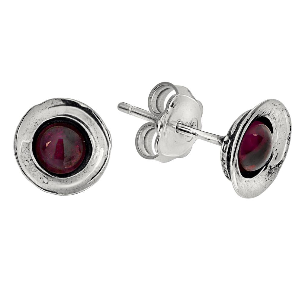 Стильные серебряные серьги с натуральным индийским гранатом. Замок пусета (гвоздик) прочно фиксирует серьгу в ухе. Огранка граната - кабошон круглой формы, диаметр камня - 0,5 см. Диаметр серьги - 0,9 см. Традиционно израильские украшения не родируются, а покрываются чистым серебром 999 и оксидируются (чернятся). Черненое серебро надежно защищено от воздействия внешних факторов. Украшения Эйлат произведены вручную израильскими ювелирами по старинной технологии. В коллекции винтажных украшений Вы не найдете двух одинаковых изделий. Маленькие круглые пусеты с натуральным камнем выгодно подчеркнут вашу индивидуальность, подойдут как на каждый день, так и для создания необычных, праздничных и вечерних образов. Причудливые формы, неровные поверхности, изогнутые линии, мягкие переходы - все это элементы дизайна EILAT, позаимствованные у природы.