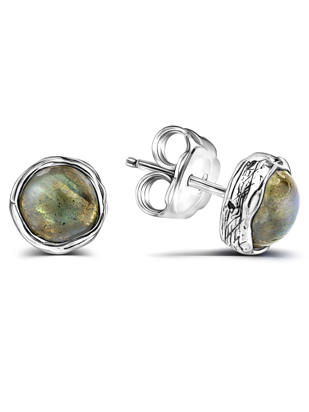 Серебряные серьги с натуральным лабрадоритом из Канады. Замок пусета (гвоздик) прочно фиксирует серьгу в ухе. Диаметр серьги - 1 см. Традиционно израильские украшения не родируются, а покрываются чистым серебром 999 и оксидируются (чернятся). Черненое серебро надежно защищено от воздействия внешних факторов. Украшения Эйлат произведены вручную израильскими ювелирами по старинной технологии. В коллекции винтажных украшений Вы не найдете двух одинаковых изделий. Круглые пусеты с натуральным камнем выгодно подчеркнут вашу индивидуальность, могут быть вечерним аксессуаром или украшением на каждый день. Причудливые формы, неровные поверхности, изогнутые линии, мягкие переходы - все это элементы дизайна EILAT, позаимствованные у природы.