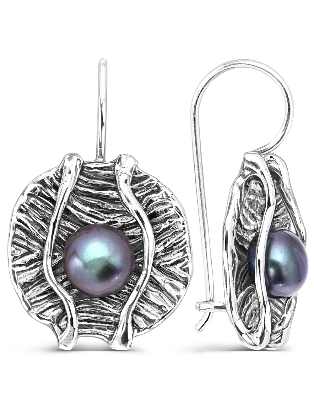 Красивые крупные серебряные серьги в винтажном стиле с натуральным жемчугом. Серебро 925, ручная работа, производство Израиль. Необычные объемные круглые серьги с натуральным черным камнем выгодно подчеркнут вашу индивидуальность, могут быть вечерние, праздничные, акцентные.
