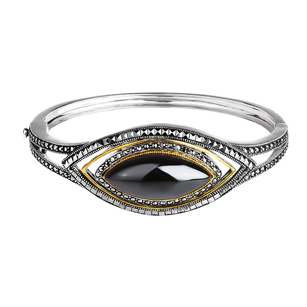 Яркий жесткий браслет «Волшебное зеркало» из серебра 925 пробы инкрустирован 152-мя сверкающими марказитами Swarovski - как круглой, так и необычной формы огранки «Ромб». Центральный камень - натуральный гематит. Зеркальный блеск камня усиливает ободок из золота 750 пробы. Дорожку круглых марказитов Swarovski от марказитов огранки «Ромб» отделаем еще один кант из золота 750 пробы. Специальная конструкция браслета позволяет легко надевать его и надёжно фиксирует на запястье надежный замок. Ширина верхней части - 2,2 см. Коллекция ювелирных украшений «Вечные ценности» историка моды, ведущего «Модного приговора» Александра Васильева.