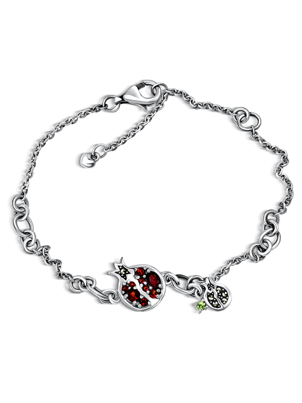 Браслет серебряный женский на руку Гранатовое вино инкрустирован 6-тью искрящимися марказитами Сваровски, перидотом и красными гранатами разного размера и формы (овал - 4 на 2,5 мм, 2 круглых граната диаметером 2,5 мм и 7 круглых - 1,5 мм). Браслет цепочка (якорное плетение), украшение на руку выполнен из серебра 925 пробы со вставкой в виде плода граната (13 на 10 мм) и подвески- граната (8 на 7 мм) (браслет с подвесками), украшенной перидотом (диаметр 1,5 мм). Браслет с гранатом. Гранат является символом любви, пробуждающим высшие энергии. Средний вес - 5,65 гр. Коллекция "Вечные ценности" - это реверанс утонченной моде начала XX века. Это вечные ценности!