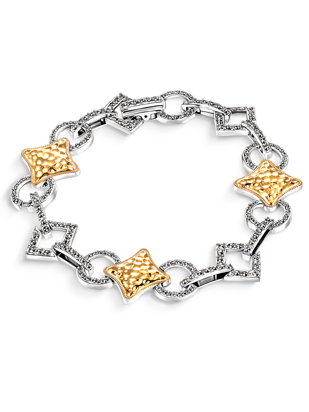 Браслет женский на руку серебро 925 пробы с натуральными марказитами и позолотой . Оригинальный браслет геометрия из звеньев оксидирован. Оксидирование - это процесс получения на поверхности серебряного изделия защитной пленки, устойчивой к воздействиям внешних факторов (капельное серебро, сеьрьги винтаж). Необычный нарядный браслет с камнями выгодно подчеркнут вашу индивидуальность, может быть вечерним аксессуаром или украшением на каждый день. Длина браслета - 19,5 см. Звенья широкого браслета - ромб - 18 на 18 мм, овал из марказитов - 11 на 10 мм, ромб из марказитов -13 на 12 мм. Средний вес - 18,1 гр. Декоративный замок является продолжением браслета. Это готовый подарок для себя или близкого человека, который несомненно произведет впечатление.