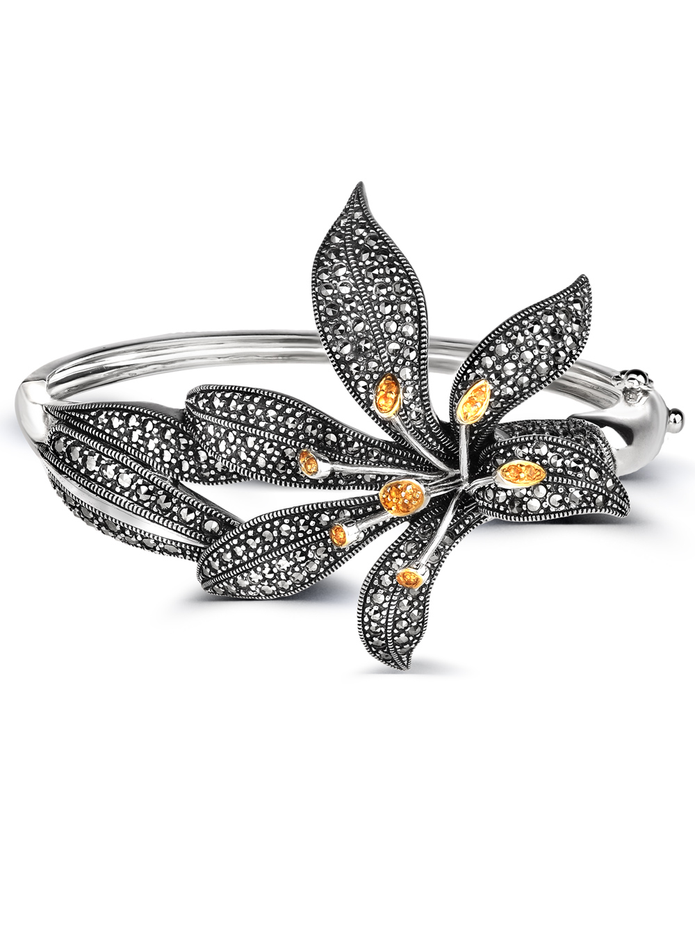 Роскошный браслет Небесная лилия из серебра 925 пробы, инкрустирован 168-мью сверкающими марказитами Swarovski, выполнен в форме цветка лилии - символа чистоты и королевской власти. Тычинки цветка украшают 16 цитринов (Шри-Ланка), обрамленных золотом 750 пробы. Размер лилии 5 - 6 см. Коллекция ювелирных украшений Вечные ценности историка моды, ведущего Модного приговора Александра Васильева. Покупка комплектом создает полностью завершенный образ. Жесткий, винтажный , дизайнерский браслет на руку. Это готовый подарок для себя или близкого человека, который несомненно произведет впечатление. Александр Васильев: Эта коллекция - реверанс утонченной ювелирной моде начала XX века. Это вечные ценности!