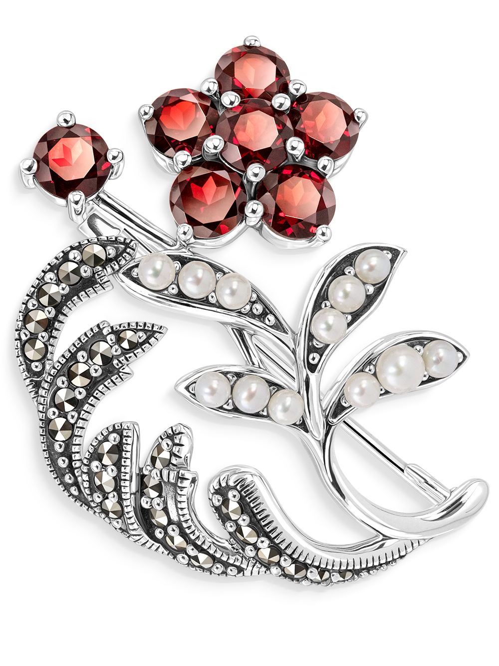 Серебряная брошь ALEXANDRE VASSILIEV с гранатом, микрожемчугом и марказитами Swarovski