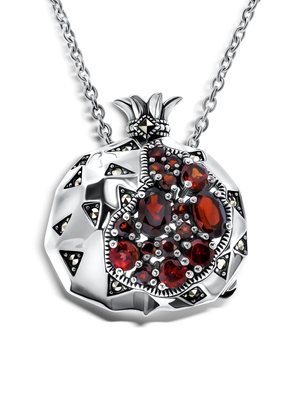 Подвеска серебряная женская на цепи Гранатовое вино инкрустирована 15-тью искрящимися марказитами Сваровски и гранатами разной формы и размера. Кулон с камнем выполнен из серебра 925 в виде плода граната (талисман). Гранат является символом любви, пробуждающим высшие энергии. Винтажный кулон на шею, серебро, укомплектован цепью якорного плетения, длина цепочки - 45 см. Круглая подвеска может быть использована как брошь серебряная. Размер подвески-броши - 35 на 27 мм. Средний вес - 12,03 гр. Подвеска съемная, при желании можно цепочку поменять! Коллекция "Вечные ценности" - это реверанс моде начала XX века. Это вечные ценности!