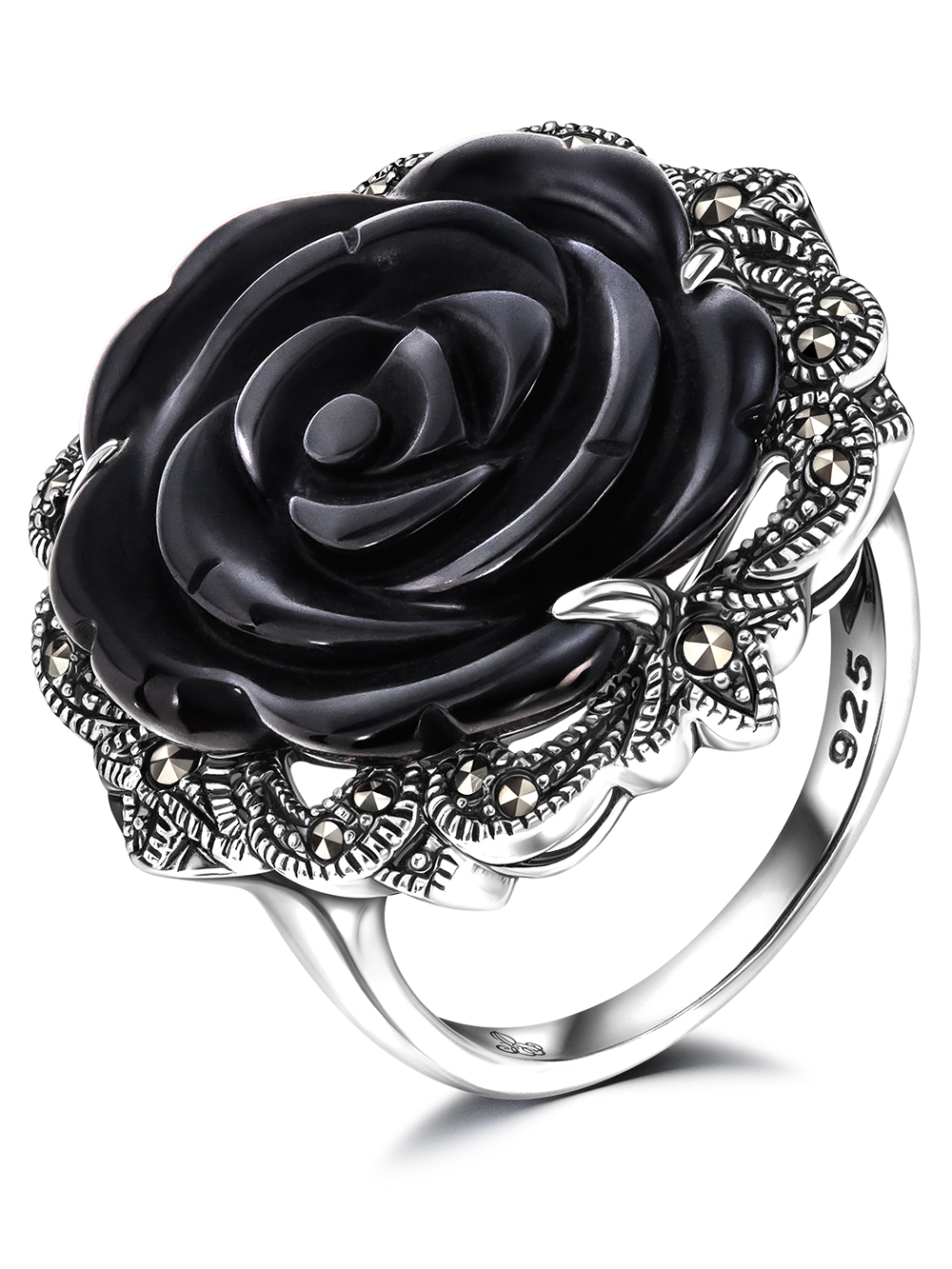 Кольцо серебро 925 Блэк Баккара. Перстень инкрустирован 20-тью искрящимися марказитами Swarovski. Центральный камень - натуральный черный оникс (Бразилия) в виде прекрасной розы. Размер верхней части кольца - 2,3см. Коллекция ювелирных украшений историка моды, ведущего Модного приговора Александра Васильева. Покупка комплектом создает полностью завершенный образ. Это готовый подарок для себя или близкого человека, который несомненно произведет впечатление. Большое кольцо с черным камнем выгодно подчеркнет Вашу индивидуальность. Эта коллекция - реверанс утонченной ювелирной моде начала XX века, поэтому ювелирное украшение можно передавать по наследству, оно не выйдет из моды!