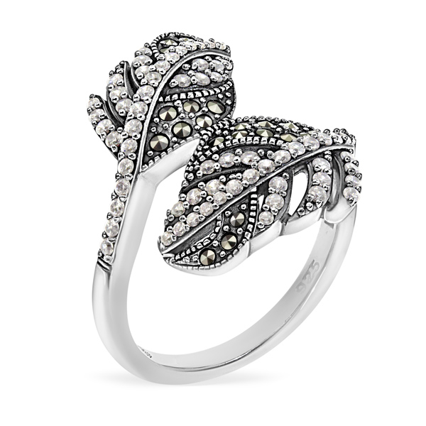 Сверкающее кольцо «La Plume brillante» из серебра 925 пробы инкрустировано 25-тью сверкающими марказитами Swarovski классической круглой огранки. Кольцо выполнено в форме двух перьев, каждый лучик пера украшен марказитами или фианитами Swarovski огранки «Бриллиант». Размер верхней части кольца - 3,2 * 1,4 см. Коллекция ювелирных украшений «Вечные ценности» историка моды, ведущего «Модного приговора» Александра Васильева.