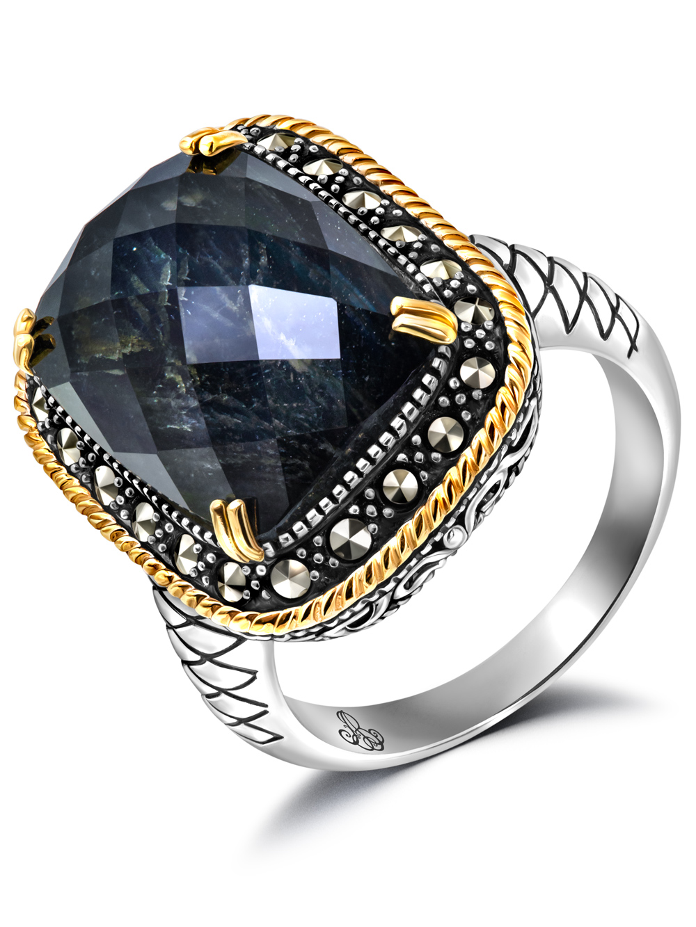 Кольцо серебро 925 пробы Тайна Шарлотты. Перстень инкрустирован 22-мя искрящимися марказитами Swarovski и позолотой. Оттенок лабрадорита может немного отличаться в комплекте, так как это натуральный уникальный камень. Центральный камень - натуральный, насыщенный лабрадорит (Канада) сверху закрытый прозрачным искрящимся горным хрусталем (Бразилия) для придания глубины и объема.