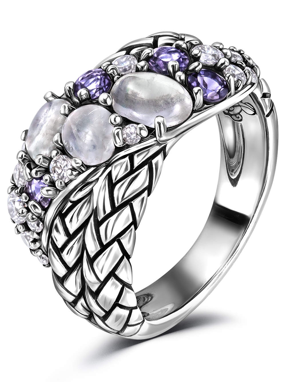 Кольцо серебро 925 пробы Ариа. Кольцо с лунным камнем натуральный (Шри-Ланка), кольцо с фианитом и лолитами. Коллекция ювелирных украшений Вечные ценности историка моды, ведущего Модного приговора Александра Васильева. Это готовый подарок для себя или близкого человека, который несомненно произведет впечатление. Нежное кольцо с натуральными камнями выгодно подчеркнет Вашу индивидуальность. Александр Васильев: Эта коллекция - реверанс утонченной ювелирной моде начала XX века. Это вечные ценности!