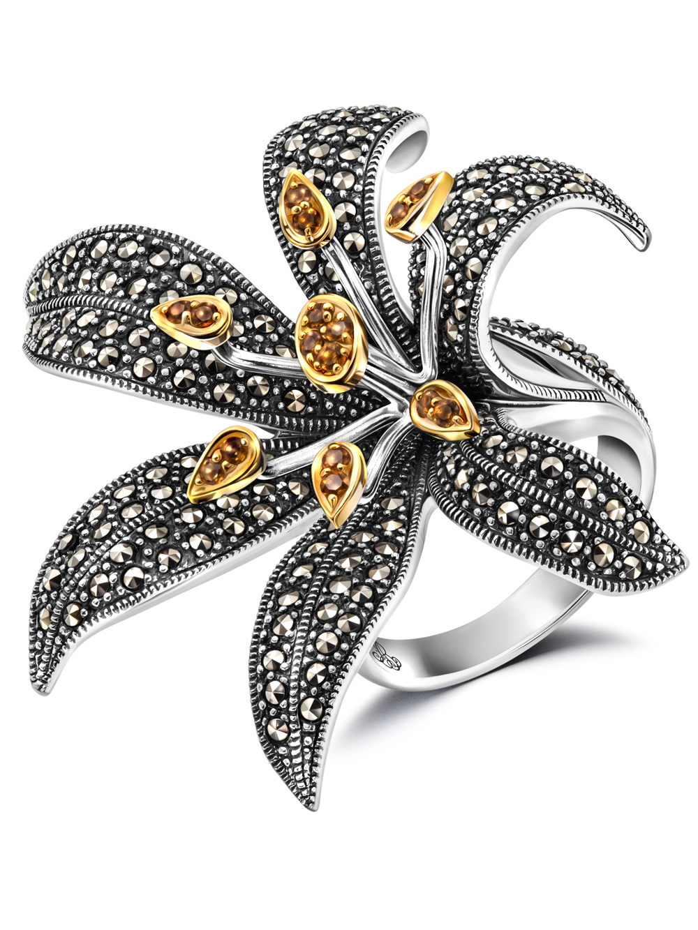 Восхитительное кольцо Небесная лилия из серебра 925 пробы, инкрустировано 148-мью сверкающими марказитами Swarovski, выполнено в форме цветка лилии - символа чистоты и королевской власти. Тычинки цветка украшают,16 цитринов (Шри-Ланка), обрамленных золотом 750 пробы. Размер цветка - 4,5 х 4,2 см. Коллекция ювелирных украшений Вечные ценности историка моды, ведущего Модного приговора Александра Васильева. Покупка комплектом создает полностью завершенный образ.