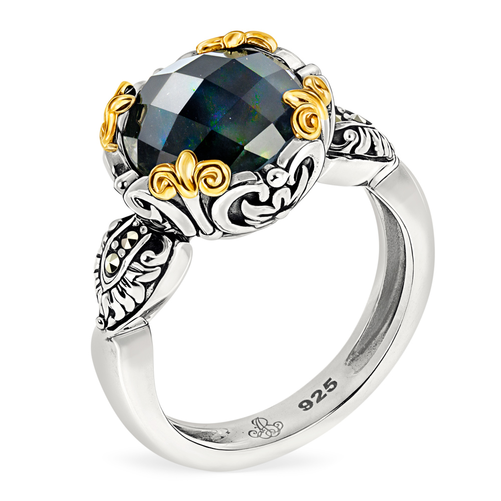 Кольцо серебряное женское с большим камнем лабрадоритом и марказитами. Покрытие - оксидирование (чернение) - это процесс получения на поверхности серебряного изделия защитной пленки, устойчивой к воздействиям внешних факторов (черненое серебро, кольцо винтажное). Круглое кольцо позолота с темным камнем выгодно подчеркнет Вашу индивидуальность.