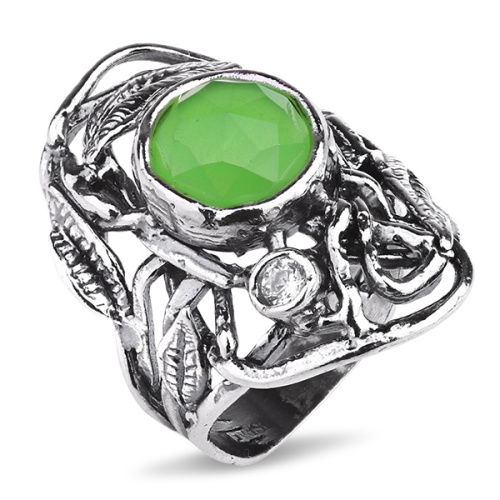 Серебряное кольцо Yaffo представляет собой крупное и яркое ювелирное изделие. Кольцо имеет вставки из камней: фианита и мятного кварца, прекрасно сочетающихся с переплетающимися серебряными листьями. Такое крупное украшение из серебра, несомненно, подчеркнет элегантность и женственность его хозяйки.