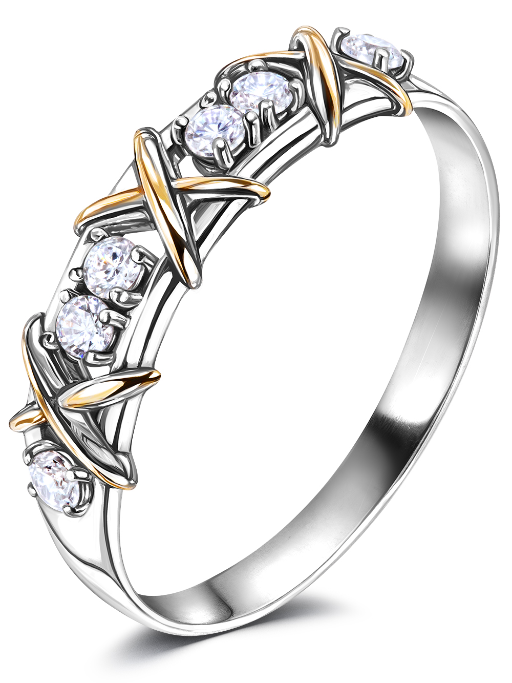 Элегантное серебряное кольцо украшено дорожкой фианитов и позолоченными крестиками. Кольцо с камнями покрыто родием - металлом платиновой группы. Родированные украшения не темнеют и внешне неотличимы от белого золота. Оригинальное двуцветное кольцо выгодно подчеркнет вашу индивидуальность, может быть вечерним аксессуаром или украшением на каждый день Диаметр фианита - 2,25 мм. Ширина шинки - 2 мм, высота кольца - 3 мм, ср. вес - 1,45 гр. Приятным дополнением является большая, приятная на ощупь фирменная коробка SILVERLIFE – готовый подарок для себя или близкого человека.