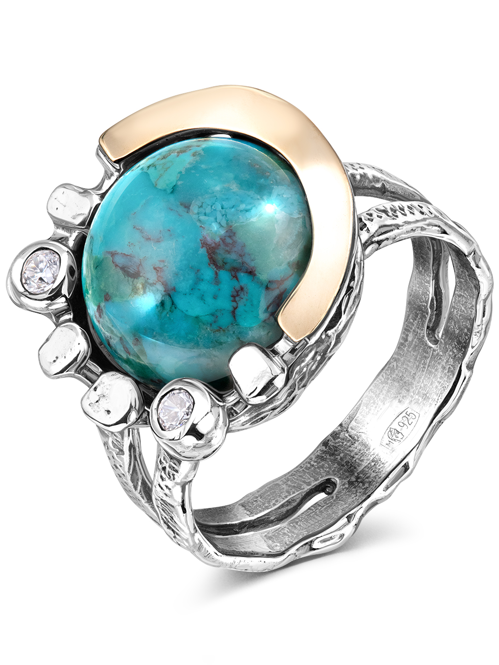 Серебряное кольцо Yaffo с бирюзой, фианитами и золотом