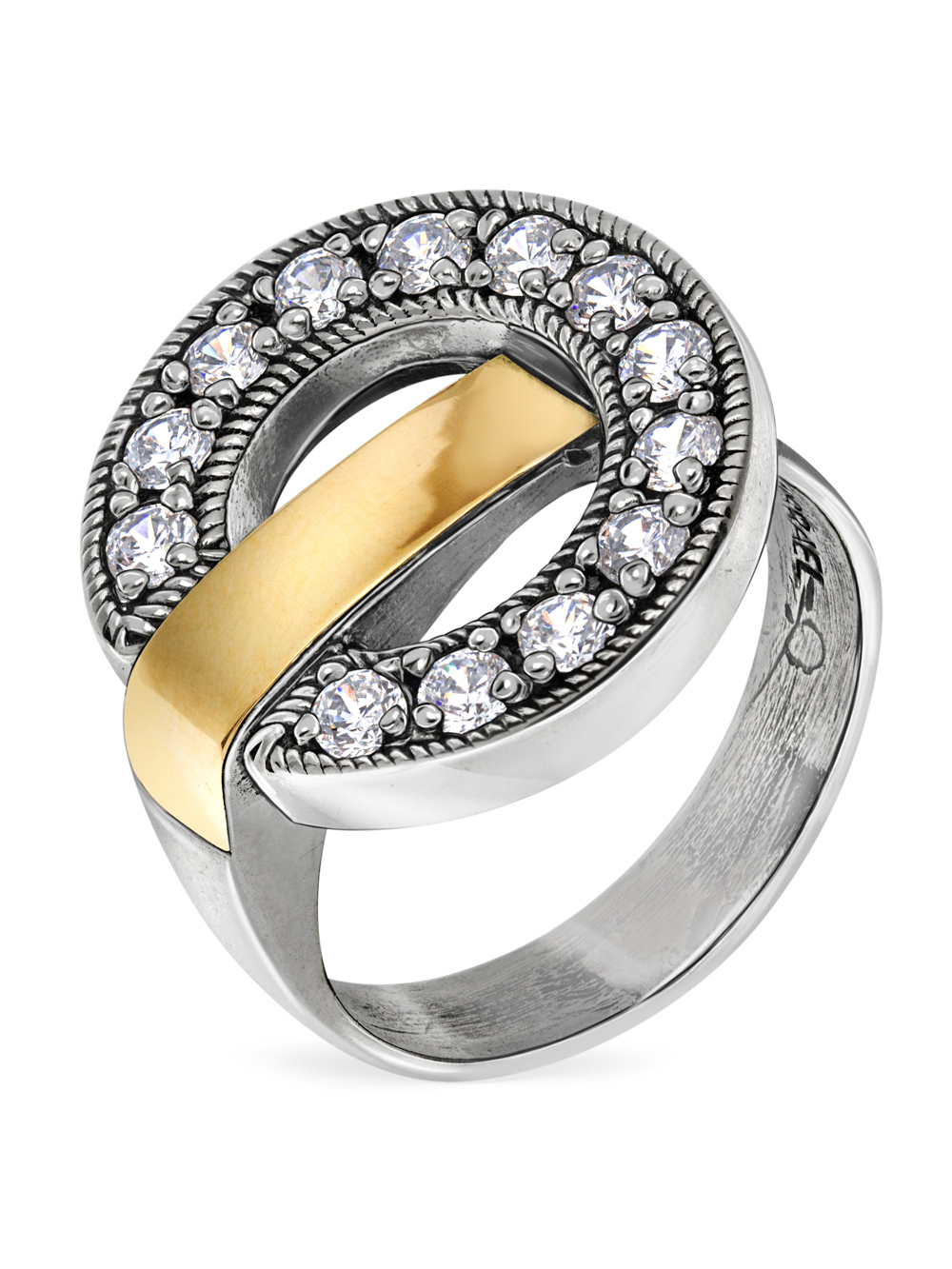 Сверкающее серебряное кольцо с фианитом украшено золотым элементом (это не позолота, а цельная золотая пластина толщиной 0,2 мм., надежно припаянная к украшению). В отличие от позолоты, золото на этом кольце никогда не сотрется. Классическая шинка удобно сидит на пальце. Размер верхней части кольца - 17 мм. Традиционно израильские украшения не родируются, а покрываются чистым серебром 999 и оксидируются (чернятся). Черненое серебро надежно защищено от воздействия внешних факторов. Украшения Эйлат произведены вручную израильскими ювелирами по старинной технологии. В коллекции винтажных украшений Вы не найдете двух одинаковых изделий. Круглое кольцо (перстень) с камнями выгодно подчеркнет вашу индивидуальность, подойдёт как на каждый день, так и для создания необычных, праздничных и вечерних образов. Причудливые формы, неровные поверхности, изогнутые линии, мягкие переходы - все это элементы дизайна EILAT, позаимствованные у природы.