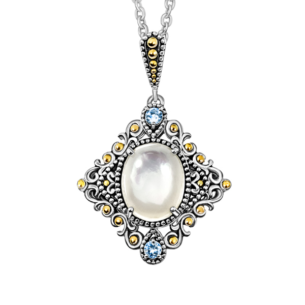 Роскошный кулон Жозефина на цепочке 925 пробы. Натуральный перламутр (Шри-Ланка) овальной формы огранки (Кабошон), размер камня - 1,1 * 0,8 см. Подвеску украшают натуральные голубые топазы и позолоченные бусинки. Ушко подвески также украшено позолоченными бусинами. Размер подвески с ушком - 3 см. Длина цепочки - 45 см. Коллекция ювелирных украшений Вечные ценности историка моды, ведущего Модного приговора Александра Васильева.