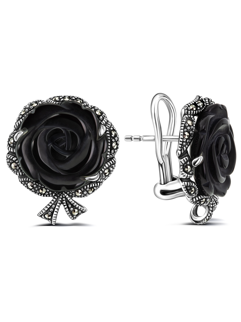 Элегантные винтажные серьги серебро 925 Блэк Баккара. Серьги женские инкрустированы 34-мя искрящимися марказитами Swarovski. Центральный камень - натуральный черный оникс (Бразилия) в виде прекрасной розы. Размер - 2,1 см. Надежный замок Омега, который прекрасно держит серьги, обеспечивает идеальную посадку. Коллекция ювелирных украшений историка моды, ведущего Модного приговора Александра Васильева.Это готовый подарок для себя или близкого человека, который несомненно произведет впечатление.
