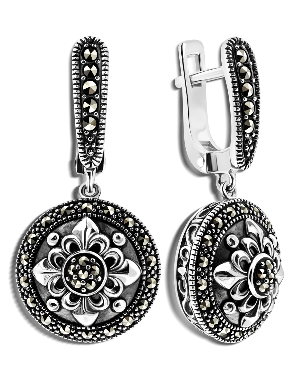 Серебряные серьги Эликсир любви инкрустированы 56-тью искрящимися марказитами Сваровски. Серьги серебро 925 пробы с подвесным элементом (диаметр 16 мм). Привлекает внимание сочетание родированного и оксидированного серебра в узоре серег. Размер серьги - 35 на 16 мм. Средний вес - 8,95 гр. Классический английский замок максимально комфортный и надежно защищает Ваши серьги от потери. Покупка комплектом создает полностью завершенный образ.Коллекция "Вечные ценности" - это реверанс утонченной ювелирной моде начала XX века. Любой комплект, сережки, браслеты, кольца или подвески никогда не выйдут из моды. Это вечные ценности!