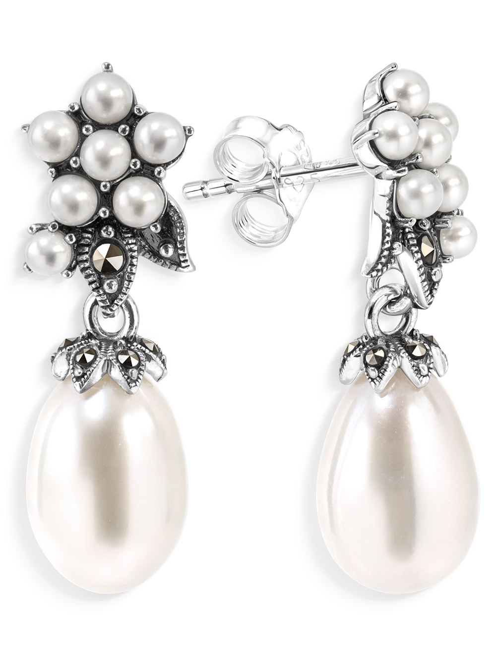 Красивые серебряные серьги цветы в винтажном стиле с натуральным жемчугом и марказитами Swarovski. Необычные милые серьги украшены редкими микро жемчужинами, которые добывают в Японском море. Ручная работа. Серьги гвоздики с натуральным белым камнем выгодно подчеркнут вашу индивидуальность, могут быть вечерние, праздничные, акцентные, свадебные. Замок пусета. Покрытие оксидирование под винтаж и старину. Черненое серебро надежно защищено от воздействия внешних факторов.