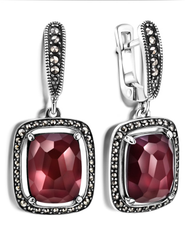 Серьги «Бургунское вино» из серебра 925 пробы инкрустированы 74-мя сверкающими марказитами Swarovsk. Центральный камень - перламутр из раковины морских моллюсков насыщенного глубокого рубинового цвета сверху закрытый искрящимся горным хрусталем для придания глубины, объема и таинственного мерцания. Надежный английский замок также украшен марказитами Swarovski. Размер серьги- 3,7 см. Коллекция ювелирных украшений «Вечные ценности» историка моды, ведущего «Модного приговора» Александра Васильева.