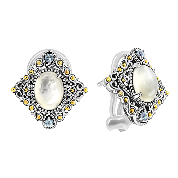 Необычные винтажные серьги Жозефина из серебра 925 пробы с натуральным белым перламутром овальной формы огранки кабошон, размер камня - 0,6 * 0,8 см. Милые серьги украшают натуральные голубые топазы и позолоченные бусинки. Размер серьги - 1,6 * 1,7 см. Надежный замок Омега, позволяющий серьге не заваливаться и надежно фиксироваться на мочке.