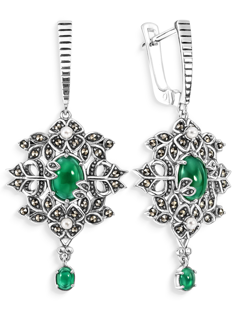 Серебряные серьги ALEXANDRE VASSILIEV с зеленым агатом, микрожемчугом и марказитами Swarovski