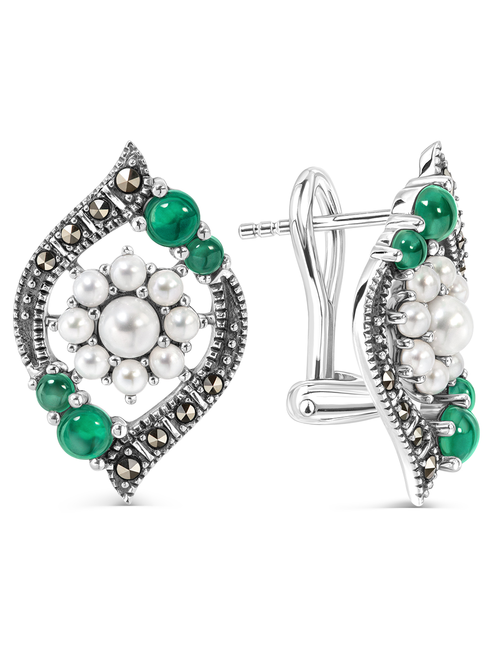 Красивые серебряные серьги цветы в винтажном стиле с натуральным жемчугом, зеленым агатом и марказитами Swarovski. Необычные милые серьги украшены редкими микро жемчужинами, которые добывают в Японском море. Ручная работа. Серьги с натуральным зеленым камнем выгодно подчеркнут вашу индивидуальность, могут быть вечерние, праздничные, акцентные, свадебные. Удобный и надежный замок омега. Покрытие оксидирование под винтаж и старину. Черненое серебро надежно защищено от воздействия внешних факторов.