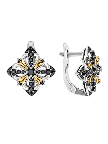 Элегантные серьги Тысяча и одна ночь из серебра 925 пробы инкрустированы натуральныой черной шпинелью. В этих серьгах гармонично сочетается черненое серебро, родированное серебро и позолота 585 пробы. Классический английский замок максимально комфортный и надежно защищает Ваши серьги от потери. Размер серьги - 16 мм.