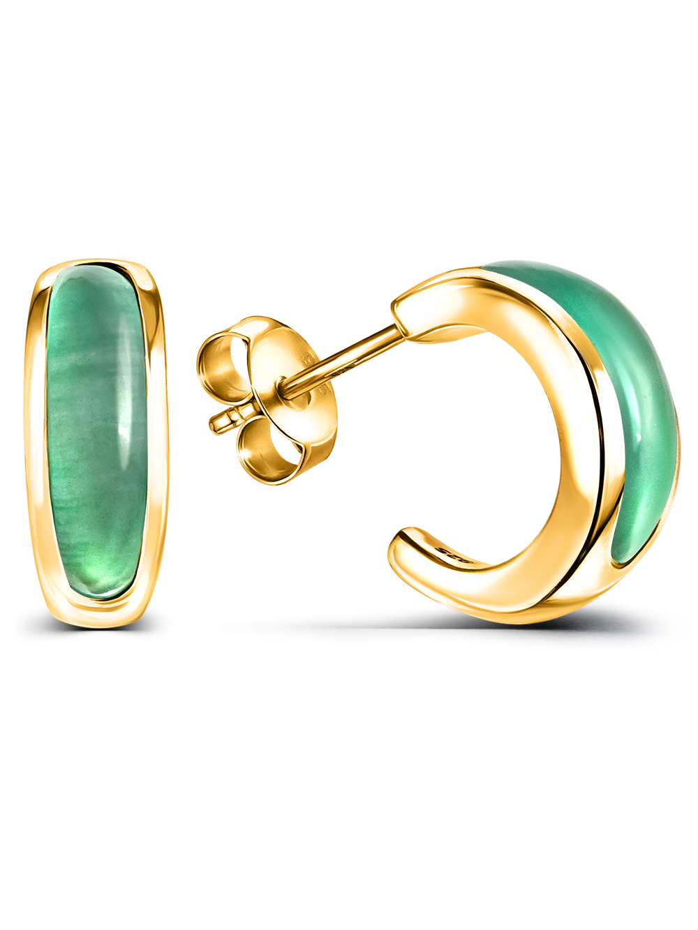 Серебряные серьги полукольца с натуральным зеленым кварцем. Современная интерпретация средиземноморского этнического стиля. Глянцевое покрытие - это позолота 750 пробы 5-10 микрон (Vermeil). Размер серьги - 13 на 6 мм. Размер кварца -13 на 4 мм. Средний вес - 4 гр. Замок пусета (гвоздик) прочно фиксирует серьгу в ухе. Этот замок позволяет регулировать степень зажатия мочки уха между декоративным элементов и замком. Необычные серьги с зеленым камнем выгодно подчеркнут вашу индивидуальность, могут быть вечерним аксессуаром или украшением на каждый день!