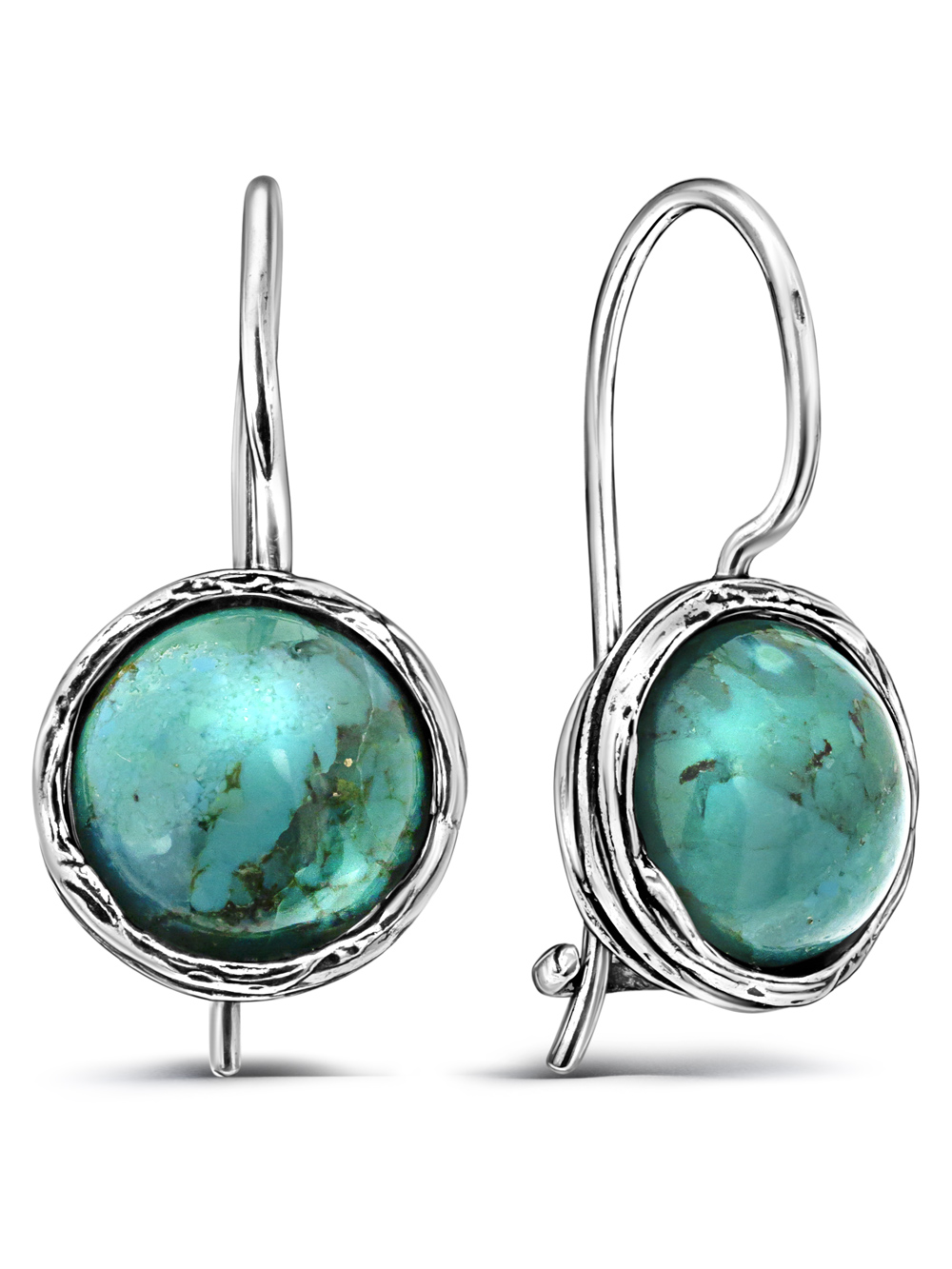 Женственные серебряные серьги с камнем натуральной израильской бирюзой. Декоративная глухая закрепка вставки (в этой закрепке камень со всех сторон опоясан металлической оправой, что исключает выпадение камня), огранка - кабошон круглой формы. Характерный для Израиля замок в виде петли с застежкой - легкий, удобный и исключает потерю серег. Диаметр вставки - 8 мм. Традиционно израильские украшения не родируются, а покрываются чистым серебром 999 и оксидируются (чернятся). Черненое серебро надежно защищено от воздействия внешних факторов. Украшения Эйлат произведены вручную израильскими ювелирами по старинной технологии. В коллекции винтажных украшений Вы не найдете двух одинаковых изделий. Причудливые формы, неровные поверхности, изогнутые линии, мягкие переходы - все это элементы дизайна EILAT, позаимствованные у природы. Длинные серьги с большим зеленым камнем выгодно подчеркнут Вашу индивидуальность.