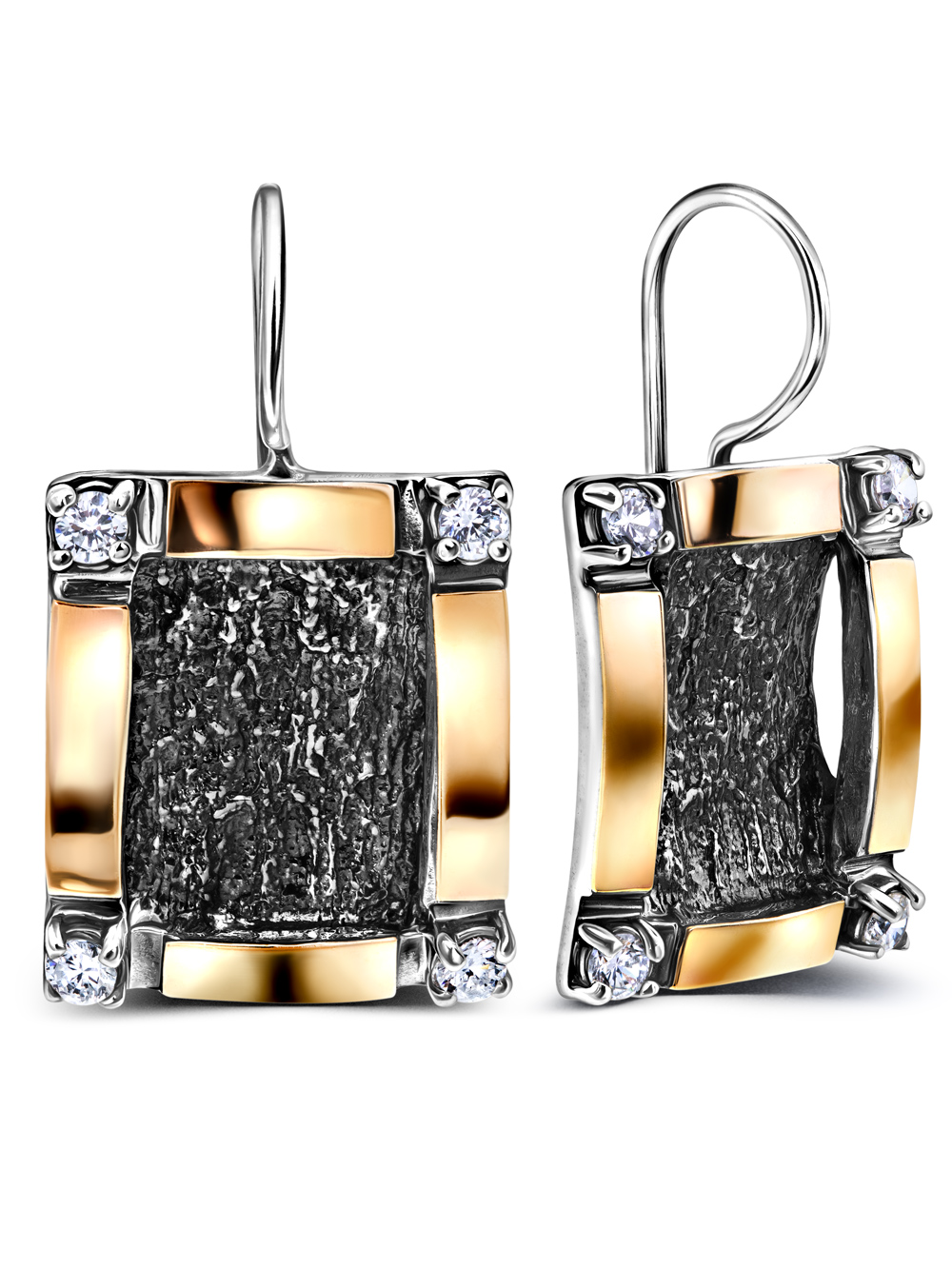 Крупные серебряные серьги квадратной формы украшены фианитами и золотым элементом (это не позолота, а цельные золотая пластина толщиной 0,2 мм., надежно припаянная к украшению). В отличие от позолоты, золото на этих серьгах никогда не сотрется. Характерный для Израиля замок в виде петли с застежкой - легкий, удобный и исключает потерю серег. Размер серьги - 30 на 17 мм. Диаметр фианита - 3 мм. Ср. вес - 10,8. Серьги длинные, объемные, квадратные. Традиционно израильские украшения не родируются, а покрываются чистым серебром 999 и оксидируются (чернятся). Черненое серебро надежно защищено от воздействия внешних факторов. Украшения Эйлат произведены вручную израильскими ювелирами по старинной технологии. В коллекции винтажных украшений Вы не найдете двух одинаковых изделий. Большие серьги с камнями выгодно подчеркнут вашу индивидуальность, могут быть вечерним аксессуаром или украшением на каждый день! Причудливые формы, неровные поверхности - все это элементы дизайна EILAT, позаимствованные у природы.