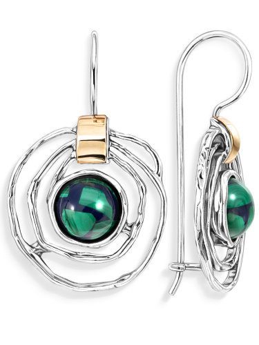 Красивые крупные серебряные серьги в винтажном стиле с натуральным азуритом. Серебро 925, ручная работа, производство Израиль. Большие серьги украшены золотым элементом (это не позолота, а цельная золотая пластина толщиной 0,2 мм., надежно припаянная к серебру). В отличие от позолоты, золото не стирается. Необычные объемные серьги с натуральным зелёным камнем выгодно подчеркнут вашу индивидуальность, могут быть вечерние, праздничные, акцентные.