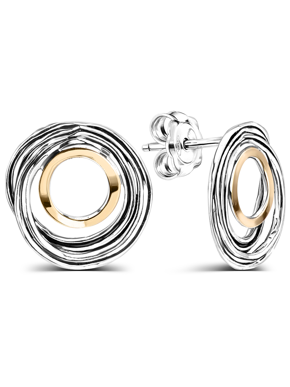 Стильные серебряные серьги в винтажном стиле украшены золотым элементом (это не позолота, а цельнае золотая пластина толщиной 0,2 мм., надежно припаянная к серебру). В отличие от позолоты, золото на этих оригинальных серьгах серебро 925 никогда не сотрется. Необычные круглые серьги выгодно подчеркнут вашу индивидуальность, могут быть вечерним аксессуаром или серьгами на каждый день. Замок пусета (гвоздик) прочно фиксирует серьгу в ухе. Этот замок позволяет регулировать степень зажатия мочки уха между декоративным элементов и замком. Размер серьги - 15 мм, ширина золотой пластинки - 1,25 мм, длина штифта - 10 мм, занижение штифта - 1,25 мм. Ср.вес - 3,3 гр.